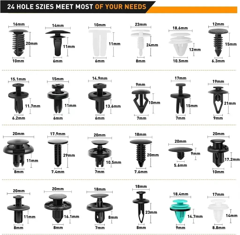 -Fastener retainer clips include 16most common sizes cover 5mm to 10mm hole sizes can exact OEM replacement for Ford,for GM,for Chrysler,for Toyota,for Honda and more.But NOT ONLY for these cars;We extra provide different size fastener removers and cable tie to help you quickly and easily remove car door panel and upholstery clips without causing damage to them.Easy access into confined areas.