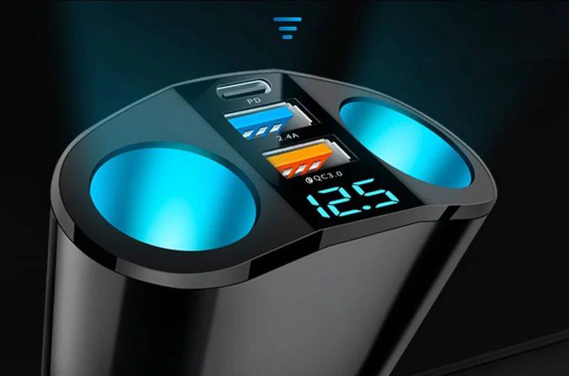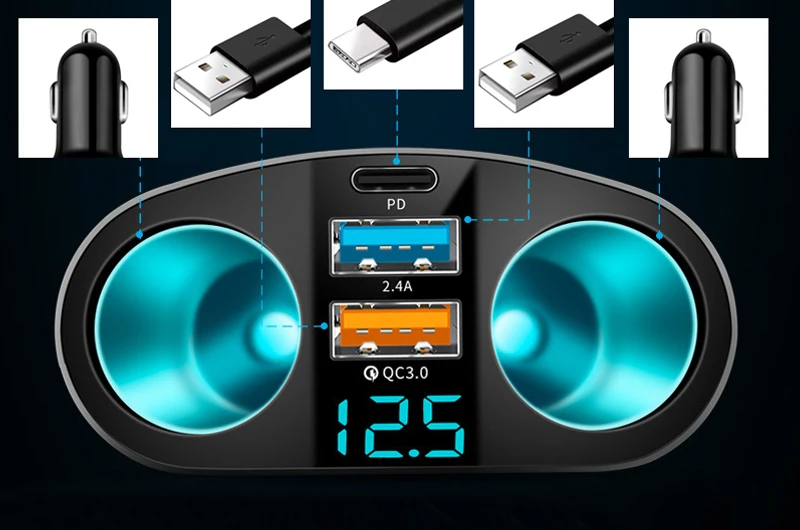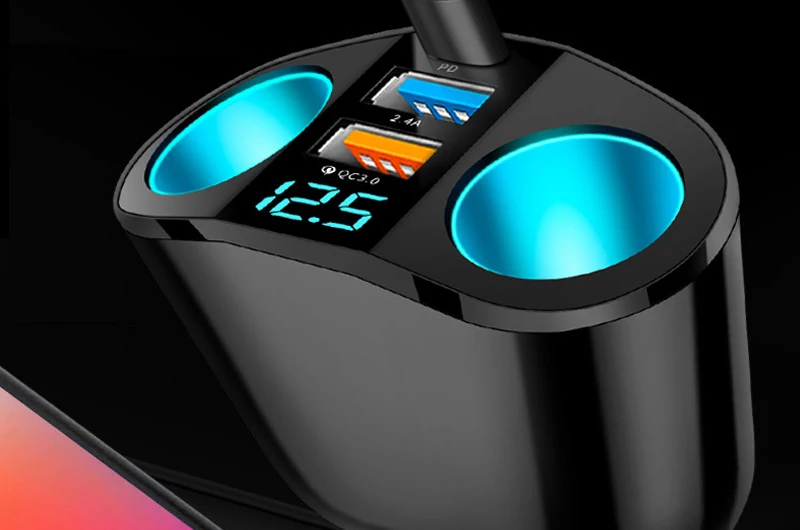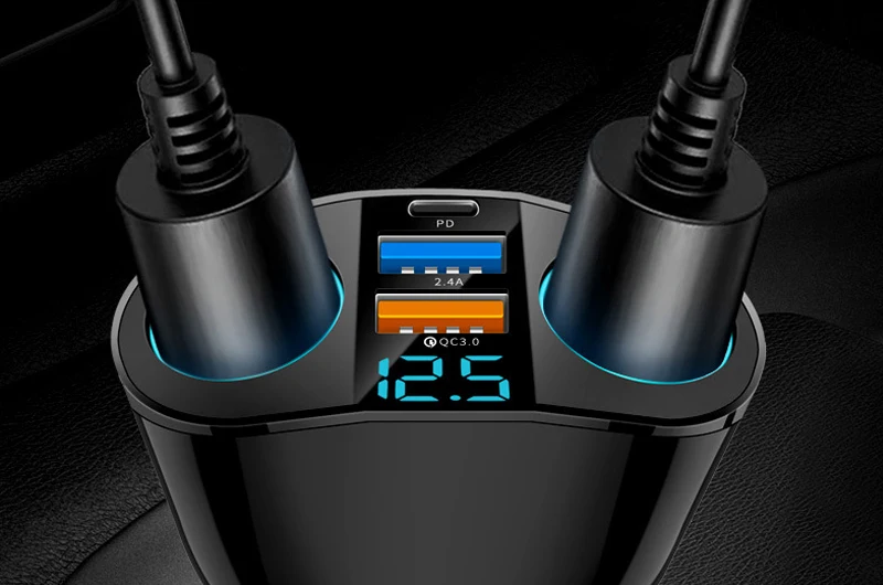 Car Lighter Adapter 66W Fast Charging PD Type C 3.0 USB Ports LED