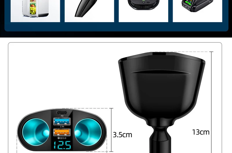 · Works in all 12V/24V vehicles (cars, trucks, RVs) | · Charges iOS, Android, USB gadgets (cameras, recorders, power banks) | · Fits any standard cigarette lighter socket