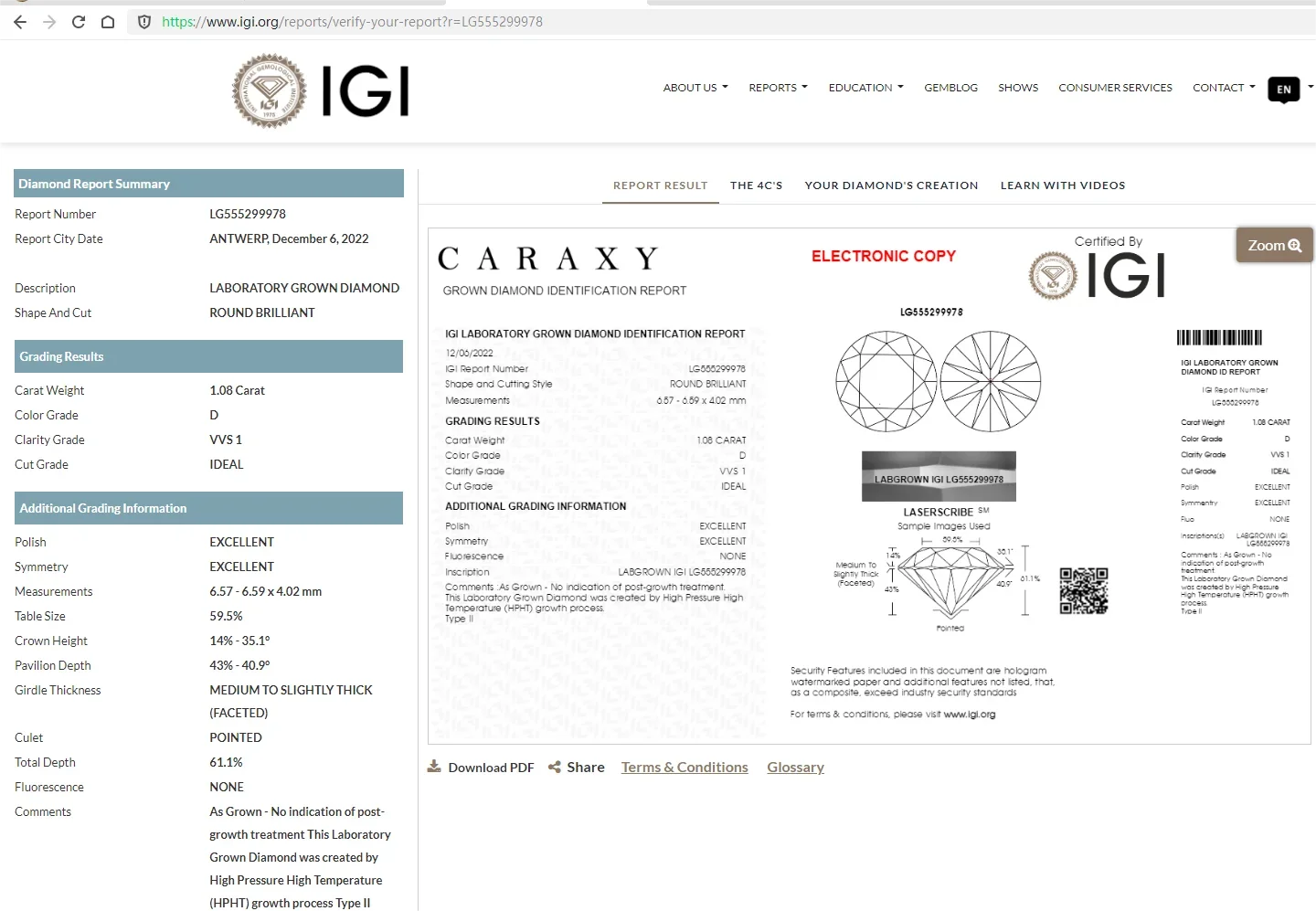 IGI Certificate 0.5ct Round Lab Diamond 5mm HPHT 3EX D/F Color VVS1 Clarity Diamond